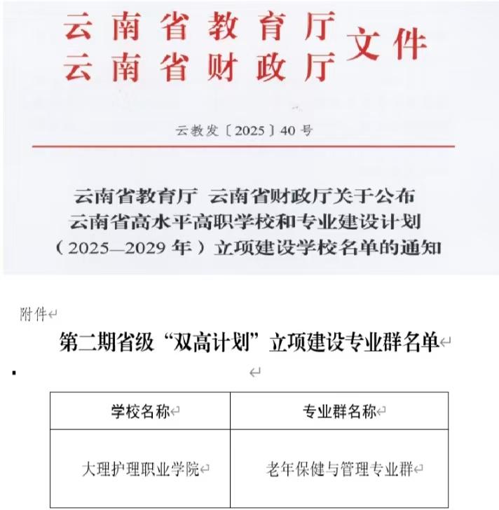 近日,云南省教育厅 、云南省财政厅联合印发《关于公布云南省高水平高职学校和专业建设计划(2025-2029年)立项建设学校名单的通知》(云教发〔2025〕40号),我校老年保健与管理专业群确定为云南省第二期省级“双高计划”立项建设专业群。