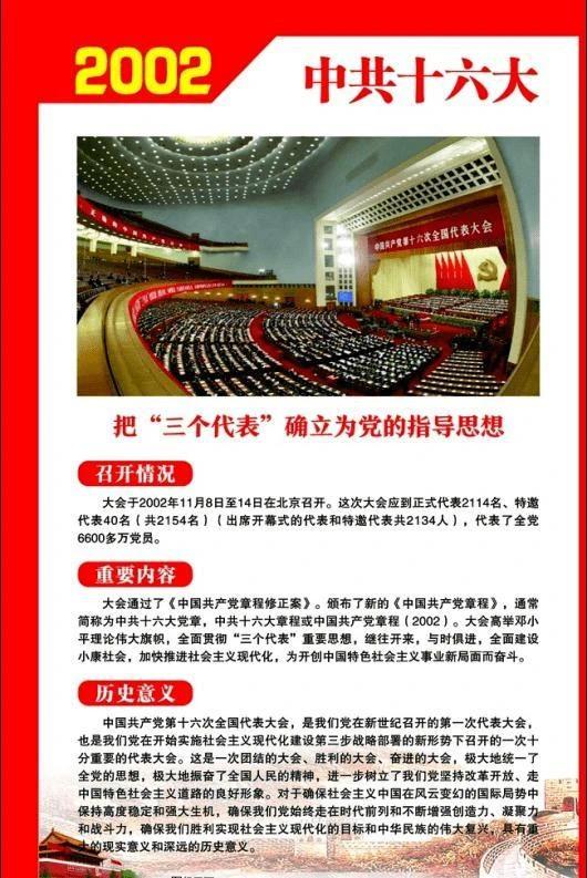 中国共产党第十六次全国代表大会于2002年11月8日至14日在北京召开。这次大会应到正式代表2114名、特邀代表40名(共2154名)(出席开幕式的代表和特邀代表共2134人),代表了全党6600多万党员。江泽民代表第十五届中央委员会作《全面建设小康社会,开创中国特色社会主义事业新局面》的报告,大会通过该报告的决议。
