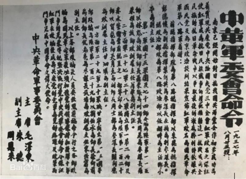 8月25日,中共中央军委发布了改红军为八路军的命令,原文如下:“南京已经开始对日抗战,国共两党合作初步成功。为着实现中共中央给国民党三中全会红军改名之保证,推动这一抗战成为全民族的抗日革命战争,我们宣布红军改名为国民革命军第八路军,着将:前总指挥部改为第八路总指挥部,以朱德为总指挥,彭德怀为副总指挥,叶剑英为参谋长,左权为副参谋长,总政治部改为第八路军政治部,以任弼时为主任,邓小平为副主任。[4] 第一军团、十五军团及七十四师合编为陆军第一一五师,以林彪为该师师长,聂荣臻为副师长;二方面军二十七军、二十八军、独立第一、第二两师及赤水警卫营、前总直之一部等部,合编为陆军第一二〇师,以贺龙为师长,肖克为副师长;四方面军二十九军、三十军、陕甘宁独立第一、第二、第三、第四团等部,改编为陆军第一二九师,以刘伯承为师长,徐向前为副师长,以上各部改编后,人员委任照前总命令行之。各师改编为国民革命军后,必须加强党的领导,保持和发挥十年斗争的光荣传统,坚决执行党中央与军委会的命令,保证红军在改编后成为共产党领导的军队,为党的路线及政策而斗争,完成中国革命之伟大使命。”