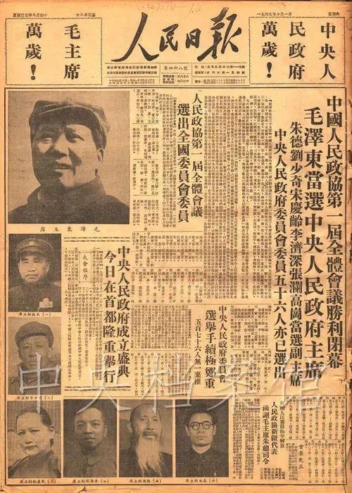 大会选举出以毛泽东为主席的由180人组成的第一届中国人民政治协商会议全国委员会;选举了由63人组成的中央人民政府委员会,毛泽东为中央人民政府主席,朱德、刘少奇、宋庆龄、李济深、张澜、高岗为副主席,周恩来、陈毅、董必武等56人为政府委员会委员。