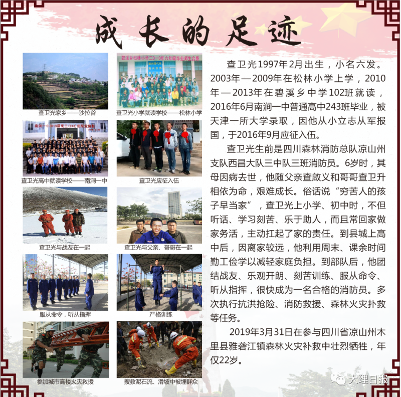 查卫光是南涧县碧溪乡松林村沙拉谷一社人,生前系四川省凉山州西昌森林消防大队三中队三班消防员。2019年3月,在参与四川省凉山州木里县雅砻江镇森林火灾扑救中,查卫光与战友不畏艰险、不怕牺牲,当先锋、打头阵,在转场中突遇山火爆燃,不幸壮烈牺牲,生命永远定格在22岁。