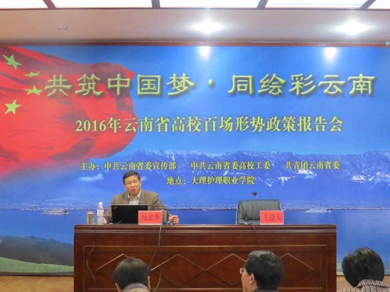 为深入学习党的十八届三中、四中、五中、六中全会精神和习近平总书记在全国高校思想政治工作会议上的重要讲话精神,树立和落实创新、协调、绿色、开放、共享的发展理念,结合云南省委高校工委关于在全省高校中开展“百场形势报告会”的工作安排,12月29日,bat365官方官网邀请云南省委、云南省高校宣讲团成员,云南省委党校副校长、云南省行政学院副院长马金书教授到校为全体教职工和部分学生代表共300多人作了“以新发展理念引领云南跨越式发展”的宣讲报告。