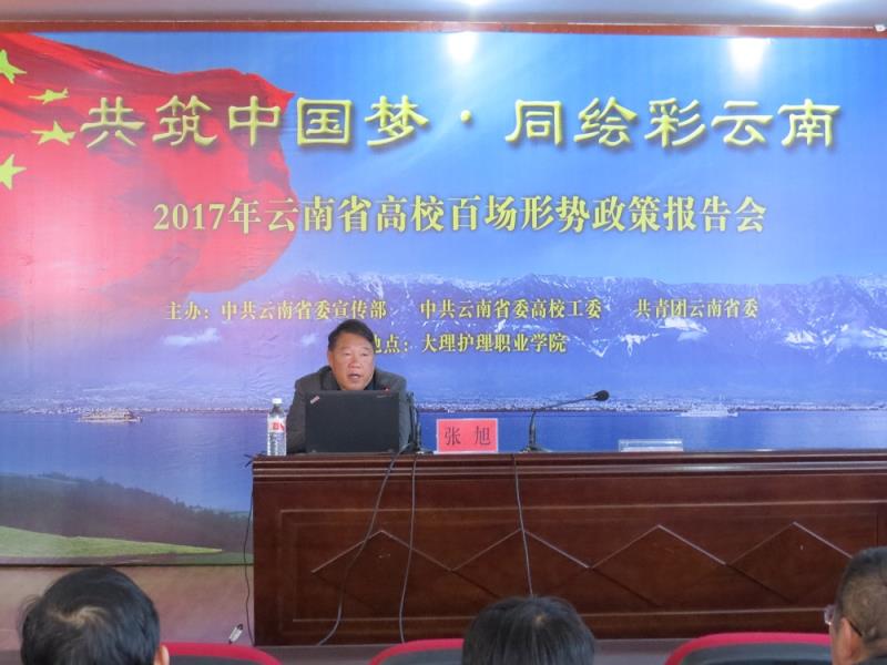 为更好地引导学院广大党员干部和师生员工全面准确地把握省第十次党代会的丰富内涵和基本要求,把思想统一到省第十次党代会精神上来,把力量凝聚到实现省第十次党代会确定的任务和目标上来,推进学院改革发展。按照省委高校工委的部署安排,3月17日上午,由中共云南省委组织部、中共云南省委宣传部、中共云南省委高校工委、共青团云南省委主办,bat365官方官网承办的“共筑中国梦、同绘彩云南”2017年云南省高校百场形势政策报告会在我院举行。此次报告会的主题为“学习贯彻省第十次党代会精神”。宣讲报告由云南省委宣传部讲师团成员、云南省高校形势政策报告宣讲团成员、云南师范大学马克思主义研究中心主任、教授张旭主讲,校党委副书记、纪委书记李宏俊主持报告会。全校教职工和部分学生代表共300多人聆听了此次宣讲报告。