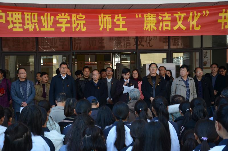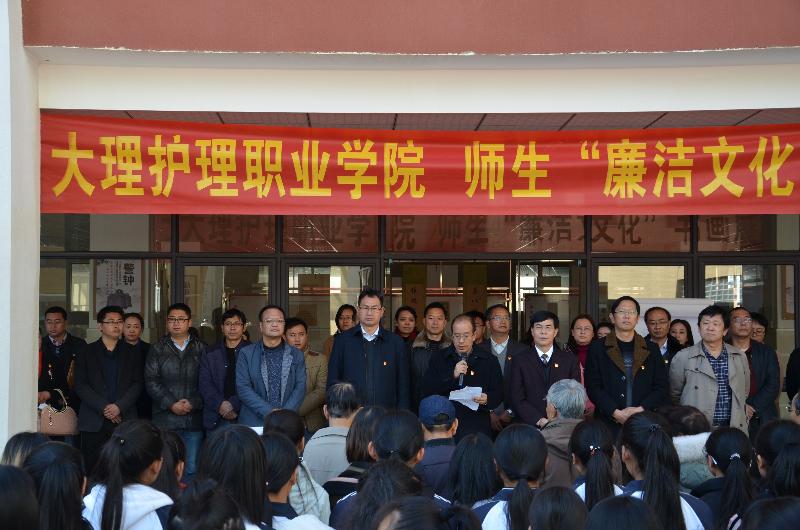 为进一步开展好廉政文化进校园工作,扎实开展党风廉政建设,努力营造一个风清气正的环境,同时也为进一步丰富广大师生的精神文化生活,全面展示学院师生的文化艺术才能。由院纪委主办,院工会和团委承办的“廉洁文化长廊”暨2018年“廉洁校园·和谐家园”师生书画展开展仪式于22日上午举行。学院领导、纪委委员、工会委员、团委委员、科室及系部负责人、党支部书记及作品入选的师生代表参加了开展仪式并观展。仪式由学院工会主席苏春华主持,州卫计委党工委委员、院党委书记王荣富宣布正式开展。蔡德周院长、李一忠、陈跃祥副院长出席仪式。