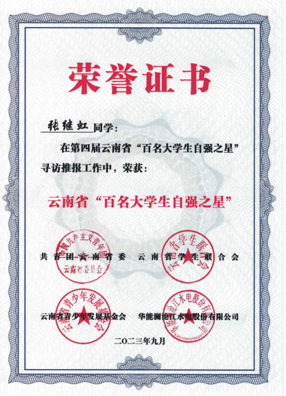 由共青团云南省委、云南省学生联合会、云南青少年发展基金会、华能澜沧江水电股份有限公司联合举办的第四届云南省“百名大学生自强之星”寻访活动落下帷幕,我校张继虹同学获第四届云南省“百名大学生自强之星”荣誉称号。