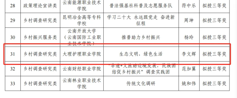 经成果征集、初筛评审、专家复审,我校李文辉同学带领的生态文明引领实践团队提交的2023年“青春百团助百村”云南大学生服务乡村振兴社会实践专项活动成果材料荣获省级三等奖。