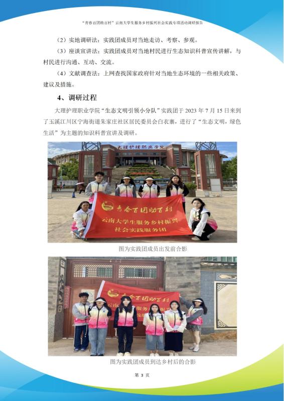 我校生态文明引领实践团队由李文辉、李晓娟、杨春、李心玥、王葶、李学朋6位同学共同组建,于2023年7月15日至25日期间在云南省玉溪市江川区开展了为期10天的“青春百团助百村”服务乡村振兴社会实践活动,切实贯彻落实团中央、团省委关于深化实施“乡村振兴青春行动”的总体部署,深入开展“寻访乡村 关注生态 助力振兴”深度走访实践活动。