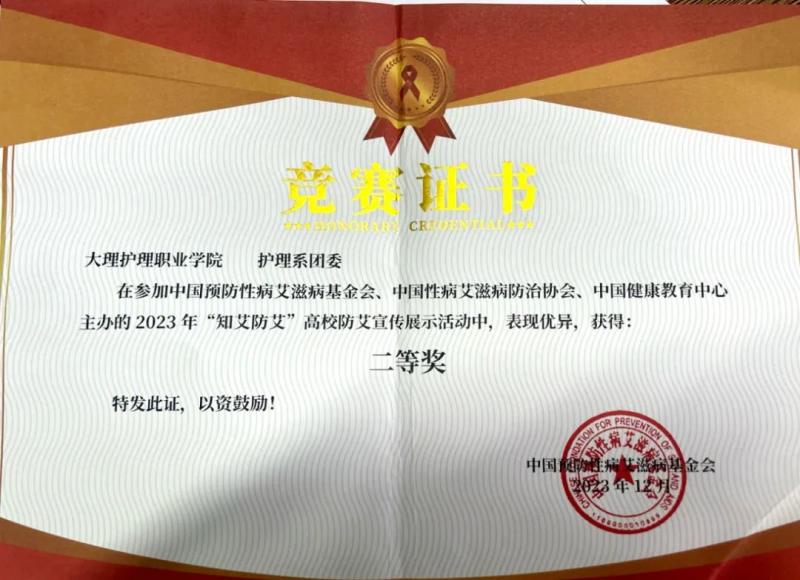 近日,bat365官方官网护理系团委在由国家疾控局传防司、教育部体卫艺司指导,中国预防性病艾滋病基金会、中国性病艾滋病防治协会、中国健康教育中心主办的“2023年全国高校防艾宣传展示活动”中荣获“二等奖”。