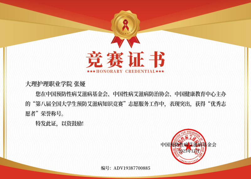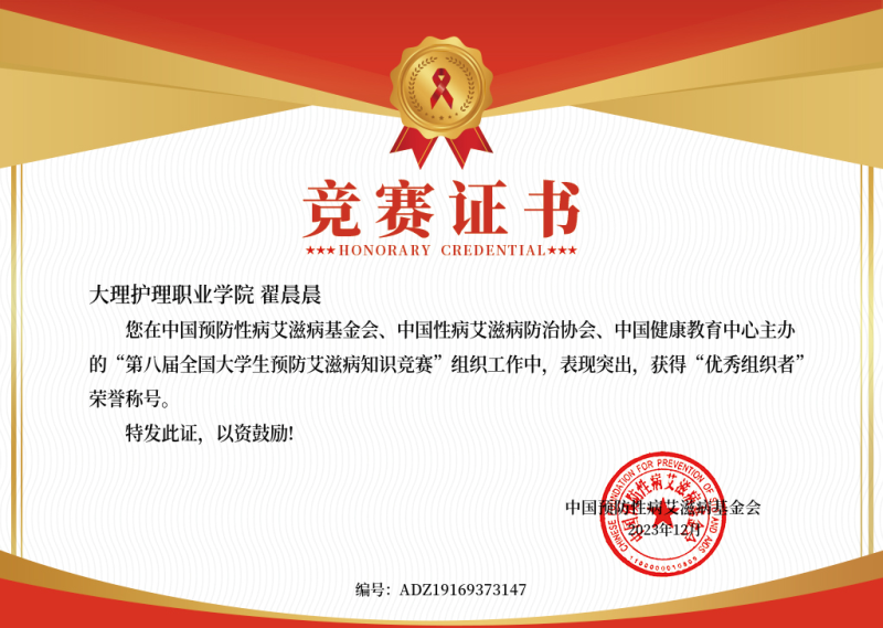 近日,bat365官方官网护理系团委在由国家疾控局传防司、教育部体卫艺司指导,中国预防性病艾滋病基金会、中国性病艾滋病防治协会、中国健康教育中心主办的“第八届全国大学生预防艾滋病知识竞赛”中荣获“优秀组织单位”荣誉称号;翟晨晨、李思薇、陆思萌、黑伟艳、符冉、杨海秋等6名大学生荣获“优秀组织者”荣誉称号;张娅、姚富正、李丹田、周娜伊、周茂娜、浦绍颖、李冬梅、卢航、苏芹玉、段桂仙、李梦蕾、沈子绢等12名大学生荣获“优秀志愿者”荣誉称号。