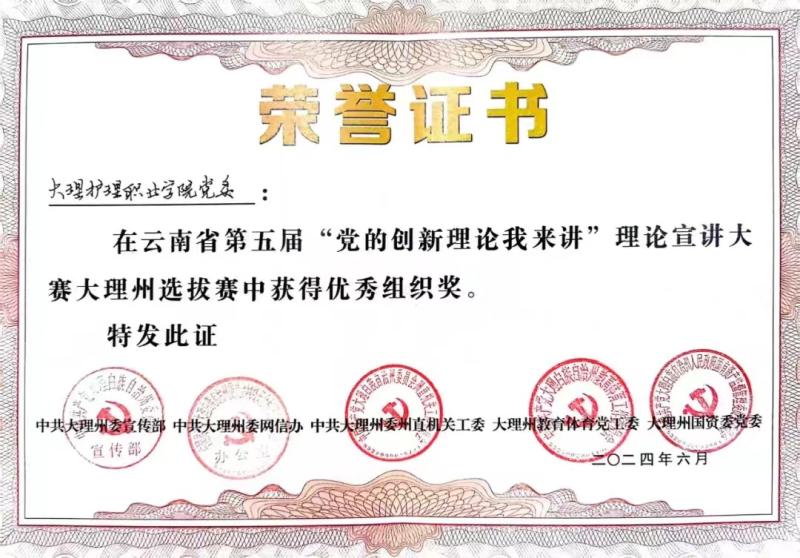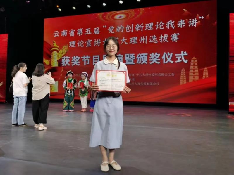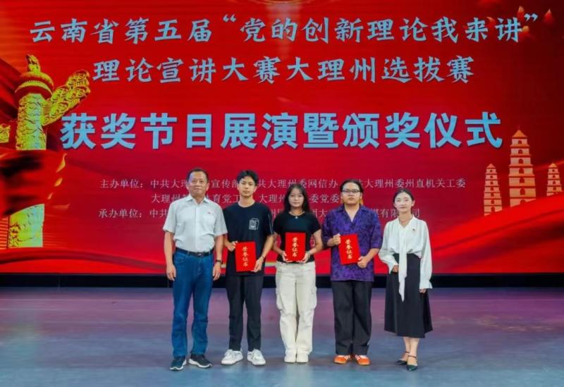 近期,bat365官方官网在由州委宣传部、州委网信办、州委州直机关工委、州教育体育党工委、州国资委党委主办的云南省第五届“党的创新理论我来讲”理论宣讲大赛大理州选拔赛中,喜获3个奖项。学校荣获“优秀组织奖”,思政教师李婷《以青春之我为中国式现代化挺膺担当》宣讲荣获语言类三等奖,学生范泽能、余婉馨、易星宇《理论在创新•时代在奋进•青年当自强》宣讲荣获文艺类三等奖。