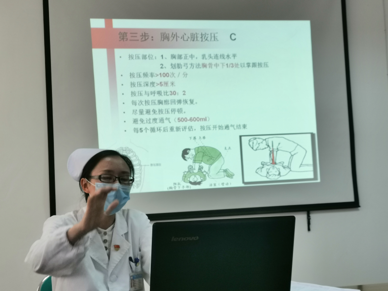 本次讲座采取知识点讲授和实操视频观看两种形式进行。培训中首先观看了“徒手心肺复苏”视频,护理部杨啟业护士长结合“心肺复苏”操作流程分解细化进行详细讲解,首先为大家讲授意识判断、自主呼吸判断、有无脉搏波动等初期判断;其次对周围环境进行判断,并立即进行呼救和拨打抢救电话等;并对操作过程中清理呼吸道、开放气道、人工呼吸、按压深度等细节进行详细讲授;最后再次播放心肺复苏的视频进行实操演示。