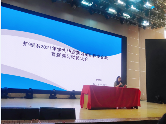 最后,学生科杨品副科长对实习期间的实习安全、组织纪律、护士职业资格证报考及新冠疫情防控等问题为学生一一进行详细讲解。希望学生遵守医院的规章制度,发扬学院学生的优良实习作风,并预祝各位同学圆满完成实习任务。