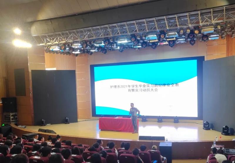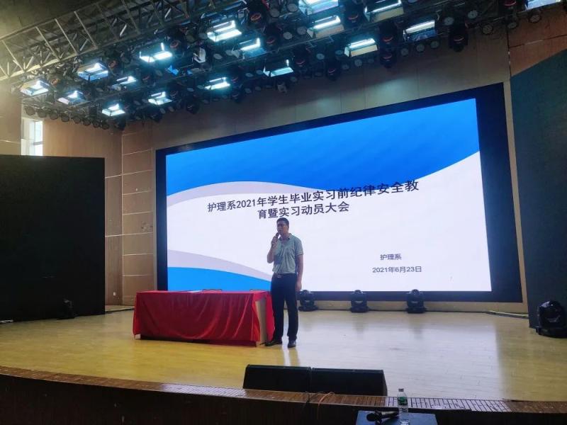 为进一步做好实习前思想及岗前培训工作,稳定同学们实习前的焦虑情绪,帮助同学们尽快适应临床实习生活,完成角色的转换,6月23日,召开了“护理系2021届学生实习前纪律安全教育暨实习动员大会”。出席本次会议的有学院教务科茶国萍副科长、实作实训部施骥文副部长,学生科杨品副科长及各实习班级班主任(辅导员),护理系实习班级学生。会议由护理系郭太兵主任主持。