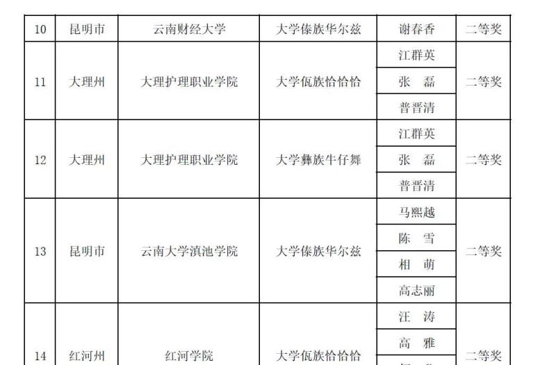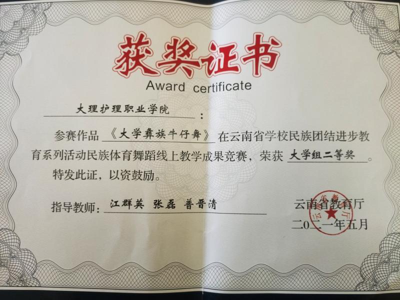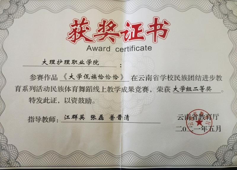 2021年5月,为落实教育部等四部门印发的《深化新时代学校民族团结进步教育指导纲要》要求,铸牢中华民族共同体意识主线,深入开展学校民族团结进步教育,弘扬和创新民族优秀文化,学校组织师生参加了云南省学校民族团结进步系列活动民族体育舞蹈线上教学和竞赛活动。在比赛中荣获《大学彝族牛仔舞》大学组二等奖、《大学佤族恰恰恰》大学组二等奖等两项奖励。