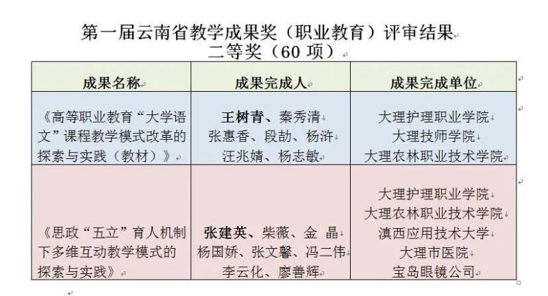 近日,云南省教育厅关于第一届云南省教学成果奖(职业教育)评审结果公示,我校王树青教授主持申报的《高等职业教育“大学语文”课程教学模式改革的探索与实践(教材)》和张建英教授主持申报的《思政“五立”育人机制下多维互动教学模式的探索与实践》均荣获第一届云南省教学成果奖(职业教育)二等奖。