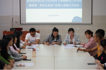 2022年6月9日,医学技术系召开2021-2022学年下学期团学工作总结暨团委、学生会各部门负责人换届工作会议。校团委张磊书记、系党支部李丹书记、系王增源副主任、系团委沈雅琪、郭殊琪老师,医学技术系团委、学生会全体成员参加了会议。