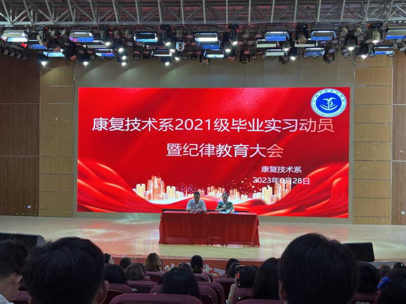 6月28日,bat365官方官网康复技术系召开2021级毕业实习动员大会暨第六届学生康复技能大赛颁奖仪式,进一步扎实做好2021级学生毕业实习工作,让学生明确实习的目的和重要意义,强化实习安全管理,正风肃纪,表彰先进。学校党委书记廖惠群出席会议,康复技术系教师和2021级全体学生参加了会议。会议由李波副主任主持。