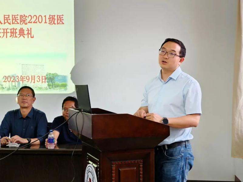 蔡德周院长回顾了院校双方教学医疗合作历程,感谢医院对医教协同办学工作的支持。在医疗水平不断进步的大背景下,学校对于医学人才的培养模式随之变化,通过医教协同来实现理论教学与临床实践的有机融合,解决学校教学与临床实际工作脱节的问题,推进医学教育改革与发展,加强医学人才实际能力的培养。他强调,同学们在学习、生活各方面要遵守纪律,互相帮助,团结协作,友好相处。