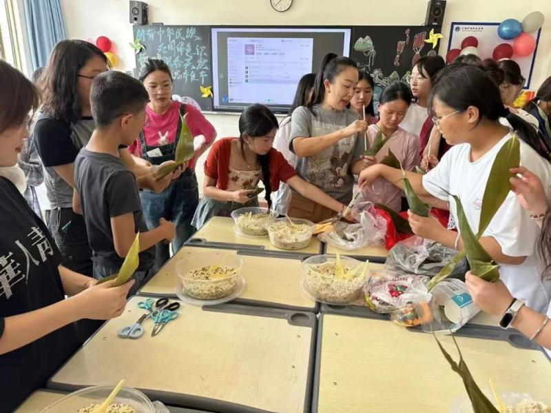 “端午临中夏,时清日复长。”端午节是中华民族传统节日,包粽子、佩香囊是端午节的重要习俗。活动中,党员同志与学生一起铺粽叶、填糯米、放粽馅、扎线绳,只见粽叶轻盈舞动,麻绳来回穿梭,一个个棱角分明的粽子就在师生们手中诞生了。后续又开展了彩绳和香囊DIY制作、盲眼吃粽子、端午节知识问答等多项别开生面的活动。在活动中感受中华优秀传统文化的魅力,在学思践悟中弘扬中华优秀传统文化。