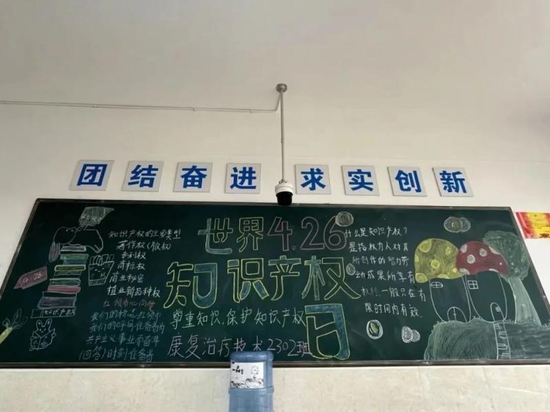 各班级学生通过开展“知识产权与人工智能”主题黑板报创作,将专业知识与艺术创作相结合,不仅清晰呈现了知识产权的概念、类型及保护途径,还以独特视角展现了人工智能在医疗护理领域的应用场景,以及其中涉及的知识产权保护要点。