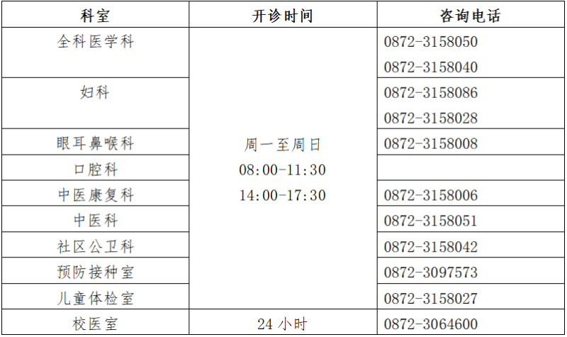 现开设有全科医学科、内科、妇科(含妇女保健)、儿科、中医科、中医康复科、眼耳鼻喉科、口腔科、社区公共科、防保科、接种门诊、医学检验科、医学影像科、校医室等14个诊疗科室。