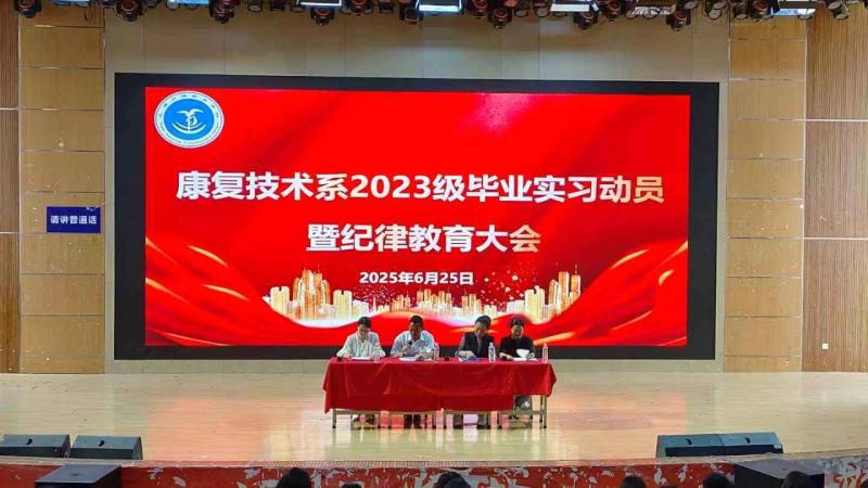 6月25日,学校康复技术系2023级学生毕业实习动员暨纪律教育大会在学校第一报告厅隆重召开。旨在帮助学生明确实习目标,做好实习准备,顺利开启实习生涯,为实习工作的有序开展奠定基础。系党支部书记朱海娟,系主任杨庆堂,系教学管理科科长杨泽冠,学生管理科科长唐琦,2023级班主任、辅导员及全体即将参加实习的学生参加大会。