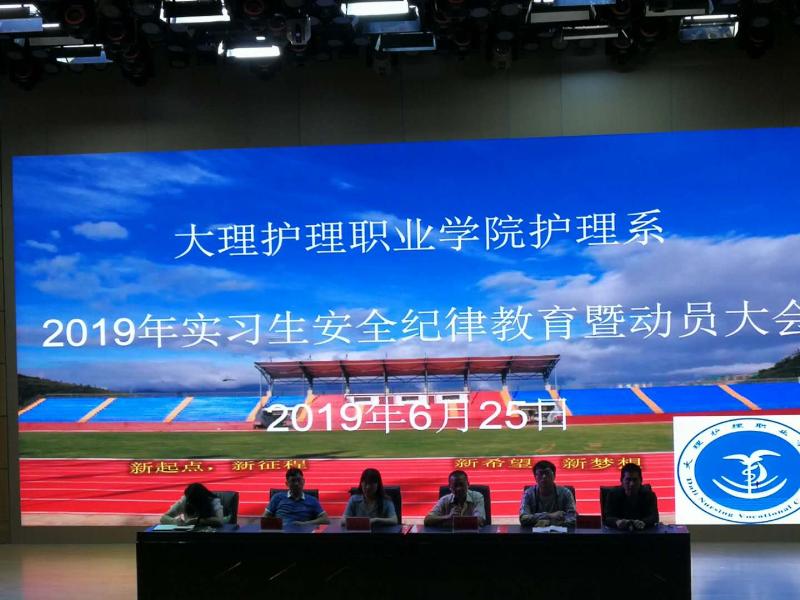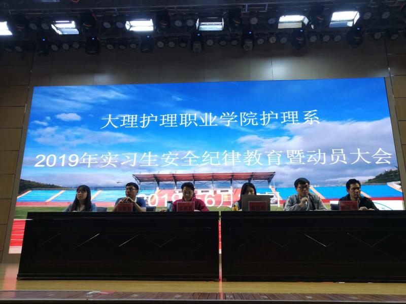 临床实习是护理专业学生十分重要的实践教学环节,为了使同学们能够更好的适应即将到来的临床实习工作,护理系于6月25日晚上7:30在学院第一报告厅开展了2019年实习生安全纪律教育暨动员大会。会议邀请到实作实训处赵玉群副处长,后勤处郭太兵副处长,招生就业处潘红发、黎雯老师,以及17级全体大专实习生、中专及开大实习生、各班级班主任约1000人参加。