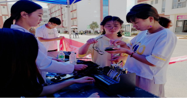 同时,给同学们进行眼镜的维修与清洁护理,并指导同学们掌握使用和佩戴眼镜的注意事项。并对有验光需求的同学们进行视力检查。在繁重的帮助服务项目之中,因为志愿者门有序的安排,同学们自觉的遵守现场纪律,活动顺利开展。