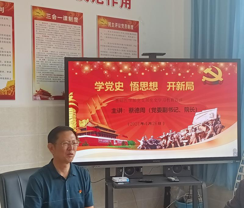 为进一步推动党史学习教育的深入开展,按照学院党委党史学习教育实施方案要求,结合基础医学部党支部实际,2021年4月26日,院党委副书记、院长,学院宣讲团成员蔡德周同志到基础医学部党支部开展党史学习教育专题宣讲,基础医学部全体党员、教师,审计科全体同志参加了本次学习。