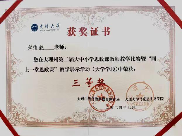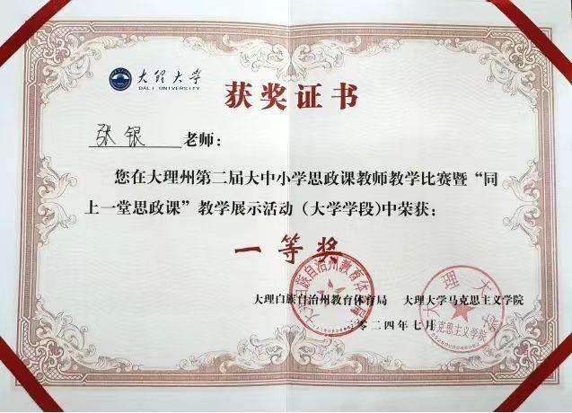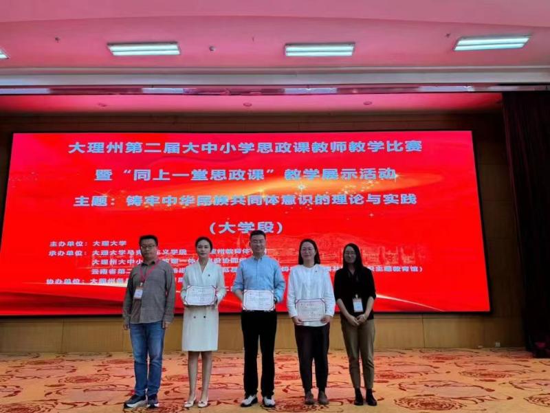 7月14日,由大理州教育体育局、大理州大中小学思政课一体化建设协同创新中心承办,大理大学主办的大理州第二届大中小学思政课教师教学比赛暨“同上一堂思政课”教学展示成功举办并圆满结束。bat365官方官网马克思主义学院选派两名思政课教师参赛获优异成绩。在大理州大学段竞赛中张银老师获一等奖,张娇滟老师获三等奖。