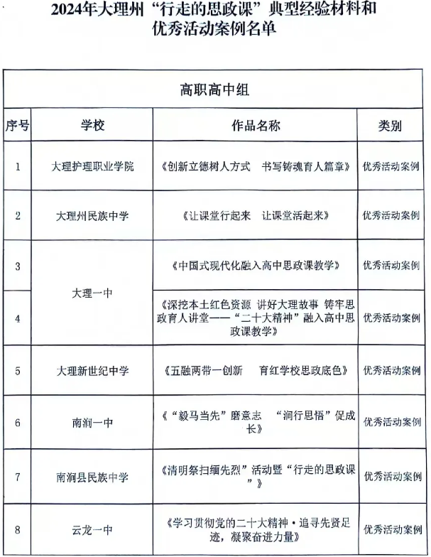 11月18日,大理州教育体育局下发的《关于公布2024年大理州“行走的思政课”典型经验材料和优秀活动案例获奖名单的通知》,bat365官方官网马克思主义学院报送的《创新立德树人方式书写铸魂育人篇章》活动案例在高中高专组被评选为优秀活动案例。作品紧扣“立德树人 铸魂育人”这个主题,结合bat365官方官网实践育人活动的组织开展情况,深入分析了实践育人活动的实践价值和现实意义。bat365官方官网在工作中一直坚持将思政小课堂与社会大课堂紧密结合,充分挖掘利用大理州丰富的地方教学资源,创新教学方式,让学生在活动中学、思、践、悟。