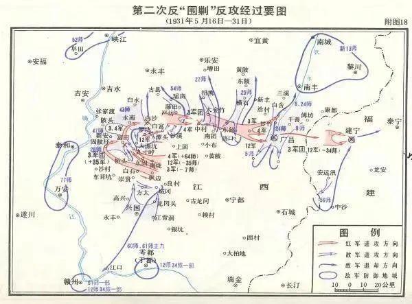 国民党军对红军第一次“围剿”失败后,蒋介石又派军政部长何应钦率20万兵力,采取“稳扎稳打,步步为营”的方针,于1931年4月1日向中央苏区发起第二次“围剿”,企图包围并消灭红一方面军主力于赣南。苏区中央局经过反复讨论,接受毛泽东的意见,决定仍采取“诱敌深入”的方针,将主力南移至广昌、宁都、石城地区,集中兵力,先打弱敌,然后自西向东横扫,各个歼灭敌人。国民党军在红军游击战袭扰下,行动缓慢。4月23日,红一方面军3万余人在毛泽东、朱德指挥下,转至龙冈、东固地区隐蔽集结。5月16日,红军突然发起攻击。5月31日,攻克福建建宁城。15天内,红军连打五次胜仗,自西向东横扫七百里,歼敌3万多人,粉碎了国民党军对中央苏区的第二次“围剿”,巩固和扩大了中央苏区。