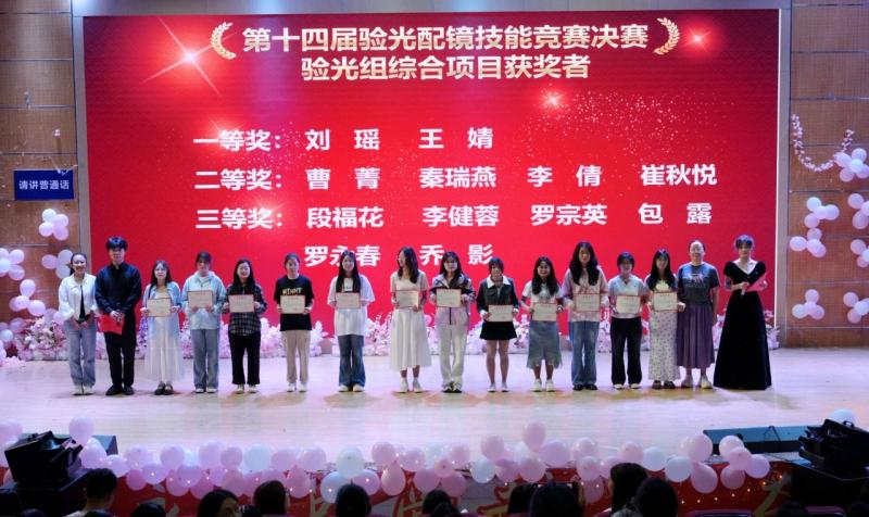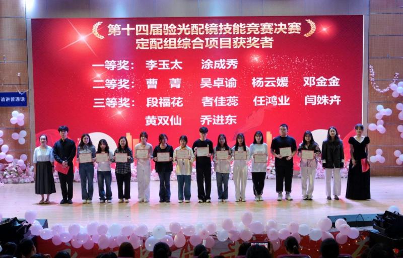 决赛现场气氛紧张激烈,参赛选手沉着冷静、操作娴熟,充分展现出扎实的理论功底和操作技能,赢得评委老师和同学们的好评,经过激烈角逐,验光组和定配组最终评选出一等奖2名,二等奖4名,三等奖6名,同时还根据单项成绩评出了检影验光、主觉验光和视功能检查、全款眼镜加工制作、基准线法点瞳高等各单项奖。