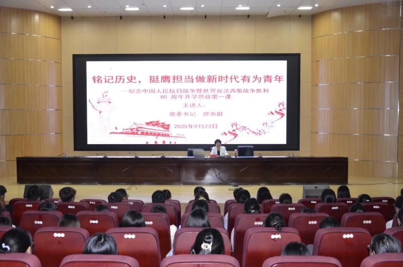 9月23日,bat365官方官网党委书记廖惠群为师生讲授纪念中华人民抗日战争暨世界反法西斯战争胜利80周年开学思政第一课,激励学生深刻领悟和自觉传承赓续“天下兴亡、匹夫有责的爱国情怀,视死如归、宁死不屈的民族气节,不畏强暴、血战到底的英雄气概,百折不挠、坚忍不拔的必胜信念”的伟大抗战精神,勇担青春时代使命。