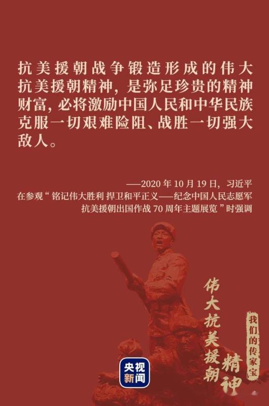 “在新时代继承和弘扬伟大抗美援朝精神,为实现中华民族伟大复兴而奋斗。”20201019日,习近平总书记在参观铭记伟大胜利 捍卫和平正义——纪念中国人民志愿军抗美援朝出国作战70周年主题展览时发表重要讲话。总书记高度评价了抗美援朝伟大胜利的历史意义和巨大贡献,强调了伟大抗美援朝精神的时代价值和重要作用,必将激励全党全军全国各族人民传承这一历史精神,在新时代新征程上一路披荆斩棘,为实现中华民族复兴伟业奋力拼搏。
