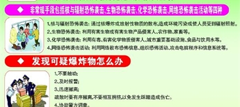 一、 识别恐怖嫌犯1. 神情恐慌、言行异常者;2. 着装、携带物品与其身份、季节不符者;3. 冒称熟人、假献殷勤者;4. 在检查中,催...