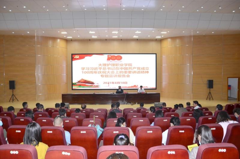 8月10日,根据大理州委党史学习教育领导小组部署安排,bat365官方官网举行学习贯彻习近平总书记在庆祝中国共产党成立100周年大会上的重要讲话精神专题宣讲报告会。报告会由州委宣讲团成员,州委党校副教授、文史教研室主任杨宗老师以“新时代的政治宣言和行动指南”为主题进行专题宣讲。学院党委领导班子成员、党员、干部和教职工139人参加宣讲报告会,会议由学院党委书记王荣富主持。