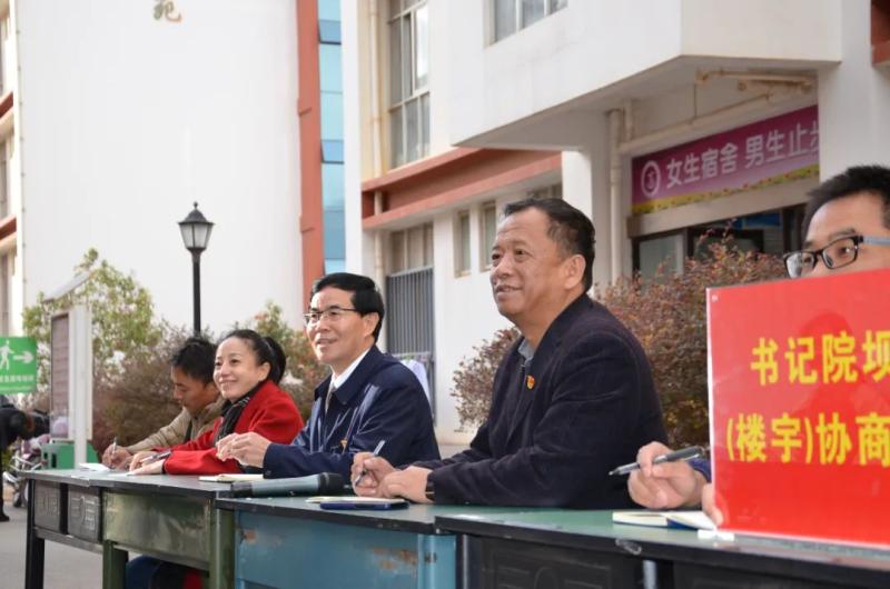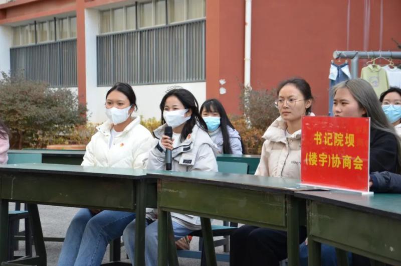 12月23日下午,为认真贯彻落实中共大理州委“大理之问”大讨论活动领导小组和党的建设工作领导小组《关于在全州探索试行“书记院坝(楼宇)协商会”做法推动“我为群众办实事”实践活动常态长效的通知》精神,学院在前期深入学生走访调研,征集意见建议的基础上,学院党委在学生宿舍区静雅苑楼前召开书记院坝(楼宇)协商会。学院党委书记王荣富,党委专职副书记字利鹏,党委委员、宣传部部长李大文,党委委员、组织部部长李洁,团委书记张磊,相关部门工作人员和25名学生代表参加协商会,会议由字利鹏副书记主持。