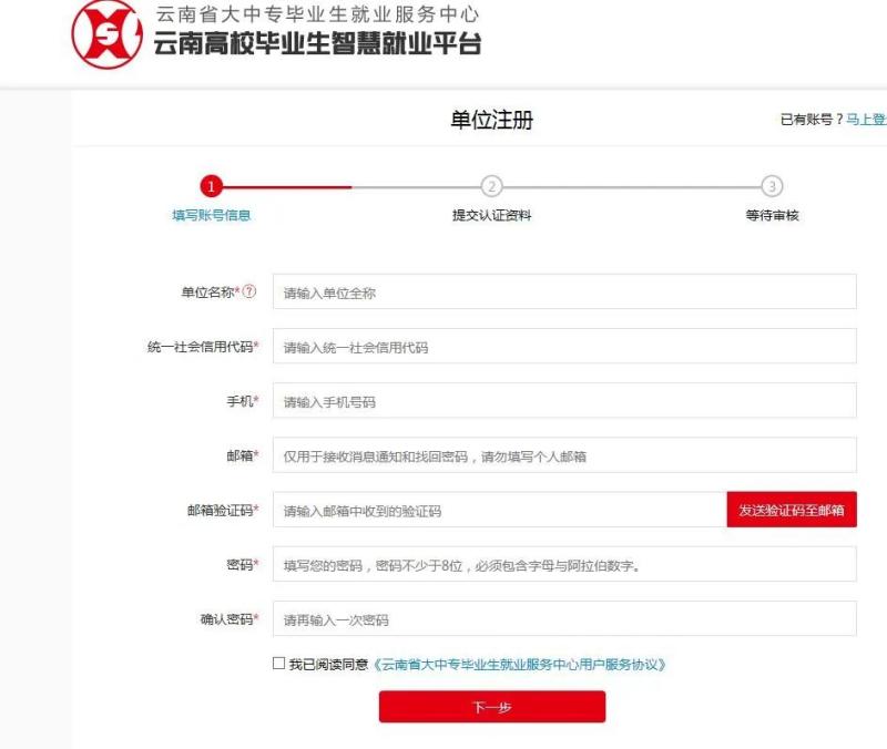 单位在网站“单位登录”-马上注册页面填写相应信息上传认证材料后提交,待学校审核通过后即可进行职位发布招聘会报名等后续操作