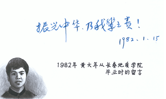 1982年1月15日,黄大年在给同学的毕业赠言中写道:“振兴中华,乃我辈之责”