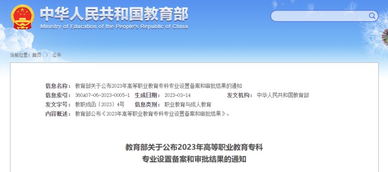 根据《普通高等学校高等职业教育(专科)专业设置管理办法》(教职成〔2015〕10号)要求,我部组织完成了2023年高等职业教育专科专业设置备案和审批相关工作,现将结果予以公布。