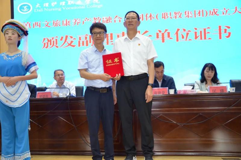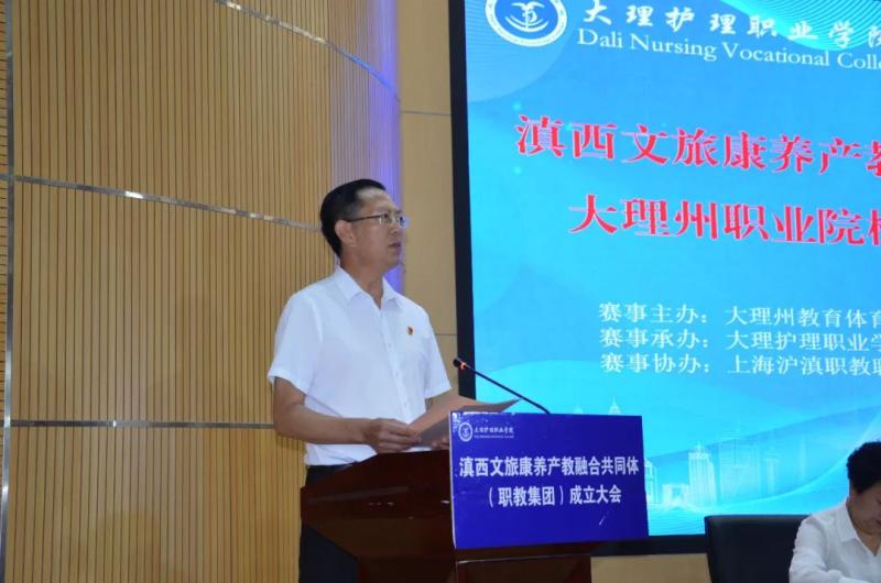 大理州人民政府副秘书长苏志敏,州教体局局长张建荣,大理大学副校长廖望科,华东师范大学教授、职业教育与成人教育研究所党委书记匡瑛,中国太平洋保险养老产业投资管理有限责任公司总监、云南省保险学会会长尹建宏,大理州人社局副局长李恒、卫健委副主任王敏、民政局副局长晁子清、总工会副主席郑斌、文旅局调研员范光明,bat365官方官网党委书记廖惠群、院长蔡德周,169家共同体(职教集团)单位代表和学校师生代表参加成立大会。
