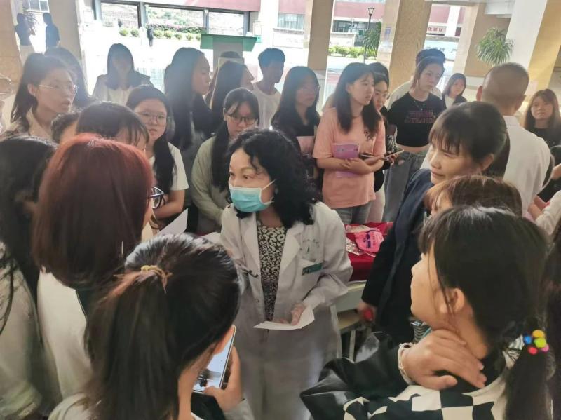 大理州药物警戒中心、大理市食品药品检验所工作人员,向参会师生发放化妆品安全科普宣传资料,科普化妆品不良反应知识,购买化妆品上当受骗后如何正确维护自己权益的方法,发放问卷调查收集化妆品不良反应情况等。大理州人民医院皮肤科主任李琼仙主任医师、王诚副主任医师在现场开展皮肤专场义诊,并就使用化妆品不良反应问题进行逐一解答。现场内容生动活泼,同学们积极参与互动,气氛热烈,师生纷纷表示,在活动中收获了贴心的关爱和诚挚的祝福,更收获了健康美丽知识。活动现场共累计发放宣传资料300余份,接受咨询义诊120余人次,问卷星参与答卷人数300余人次。