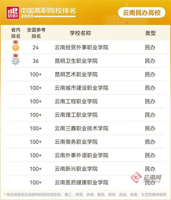 云南民办类高职院校的实力也不容小觑,有2所院校位居全国前40名,其中云南经贸外事职业学院位列全国第24名,省内民办第1名;昆明卫生职业学院位列全国第36名,省内民办第2名。