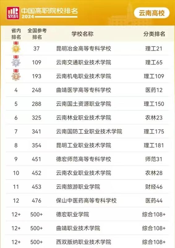 云南省理工类高职院校实力强劲,入选“双高计划”高水平学校建设单位的昆明冶金高等专科学校领跑本省高职院校,位列云南省内公办总榜第1,全国理工类第21名。云南交通职业技术学院紧随其后,位列省内公办总榜第2,全国理工类第65名。云南机电职业技术学院位列省内公办总榜第3,全国理工类第109名。曲靖医学高等专科学校在省内公办总榜位列第4,全国医药类第12名,成绩亮眼。云南国土资源职业学院则位列省内公办总榜第5,全国理工类第150名。