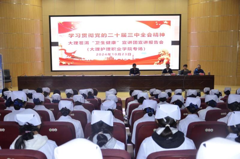10月23日,大理州卫健委大理苍洱“卫生健康”宣讲团来我校开展健康宣教进校园活动,进一步学习宣传贯彻落实党的二十届三中全会精神,为广大师生开展艾滋病防治和心理健康教育科普宣讲。此次活动由学校教务科、学生科、护理系党支部承办。活动由大理州卫生健康委党建办二级主任科员尹定松主持,共计250余名师生参与活动。