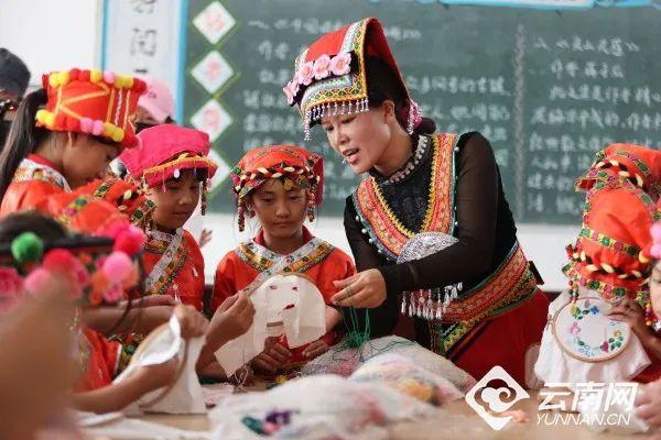 永平县北斗彝族乡九年制学校,老师带领孩子们学习民族刺绣 陈飞 摄