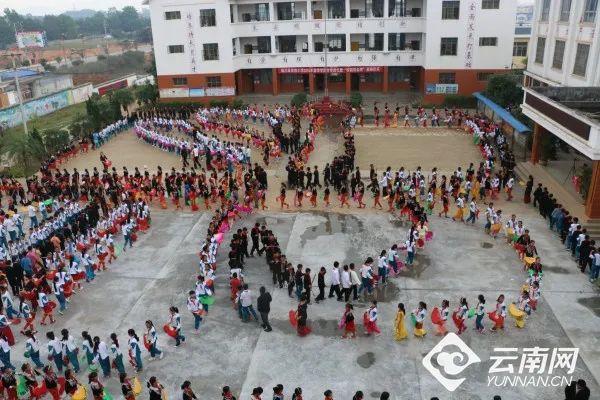 德宏州陇川县民族小学每周三的大课间活动——全校师生共舞景颇族目瑙纵歌