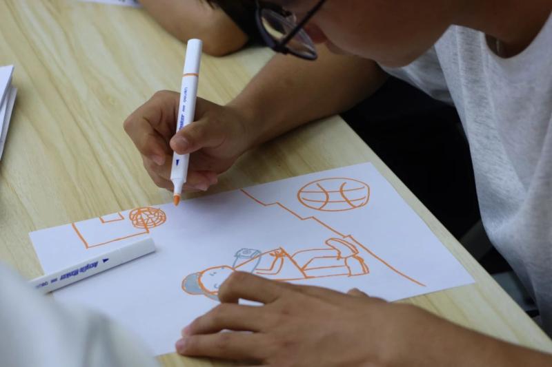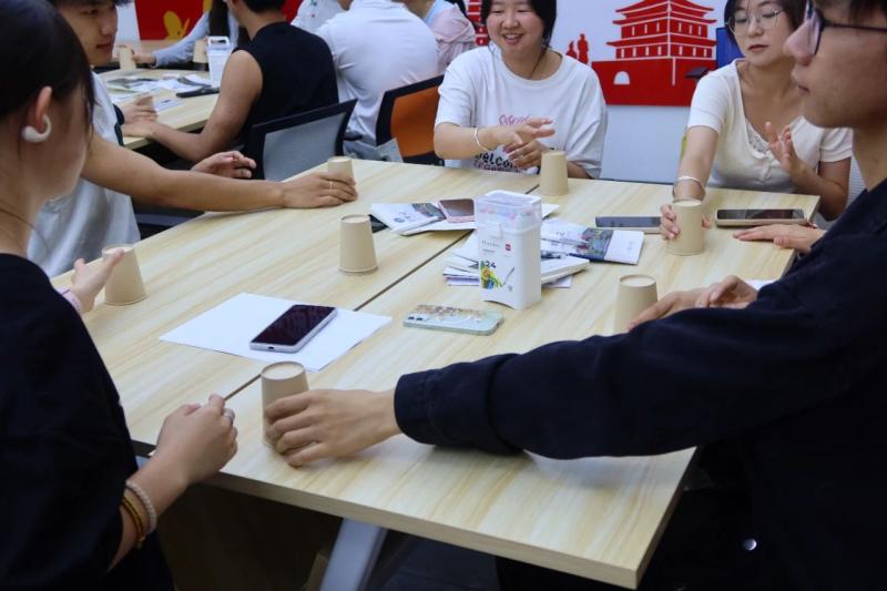 培训中,学员们根据音乐节奏进行纸杯传递,在轻松快乐的氛围中,快速进入培训状态。学员们通过“自画像”和看图自我介绍环节,以兴趣、性格、能力、价值观为引线,深入地剖析自我。