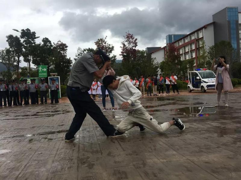 为切实加强防恐反恐工作,提高全体师生的防范意识,结合学院实际,bat365官方官网于9月18日中午在学院知行广场,组织了一次防恐反恐演习活动。bat365官方官网党委书记王荣富、学院院长蔡德周、学院副院长李一忠等领导、以及各班主任、各班班长等部分学生、志愿者及保安人员;大理市海东派出所巡逻中队的四名民警参加了此次活动。